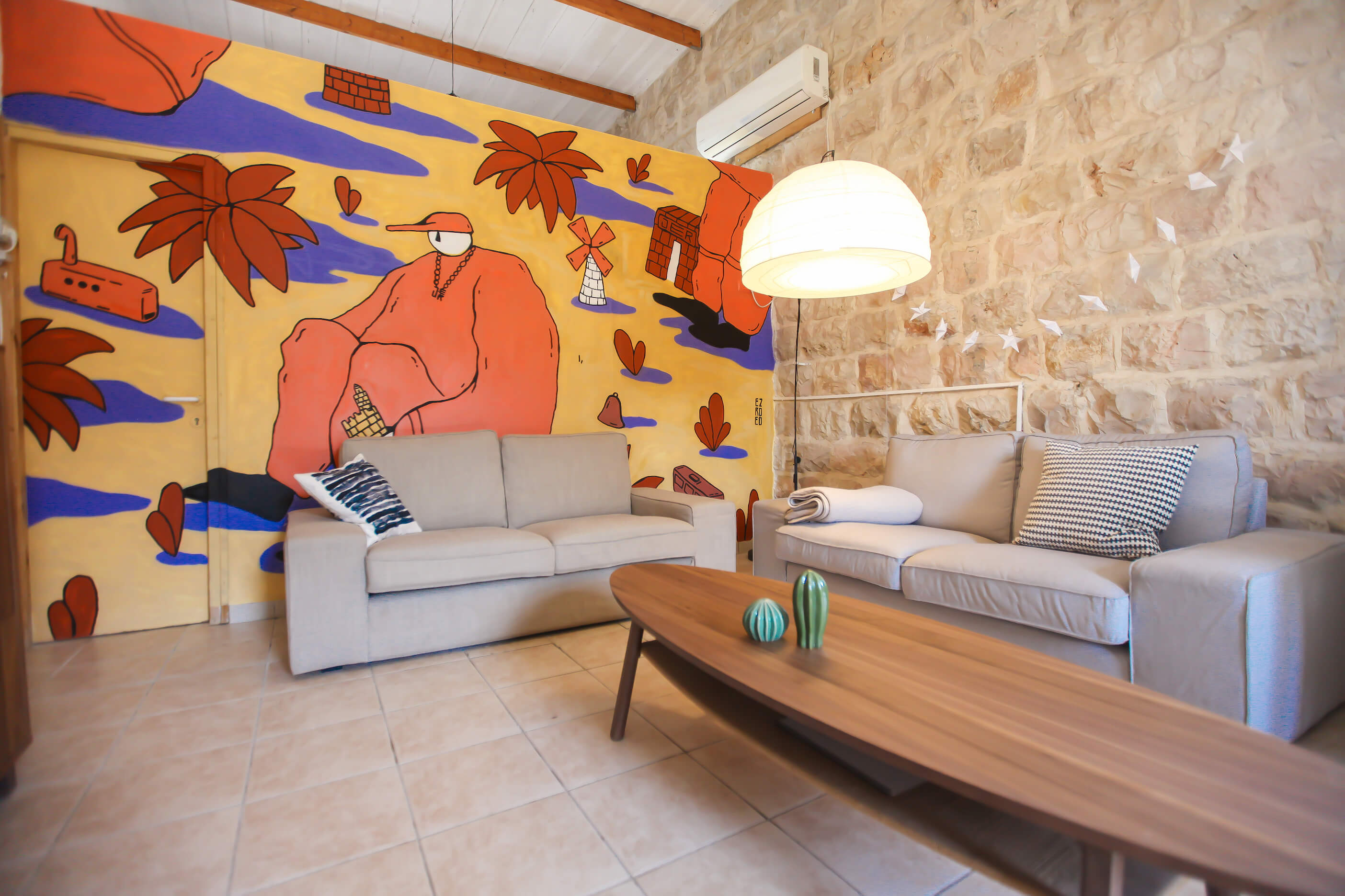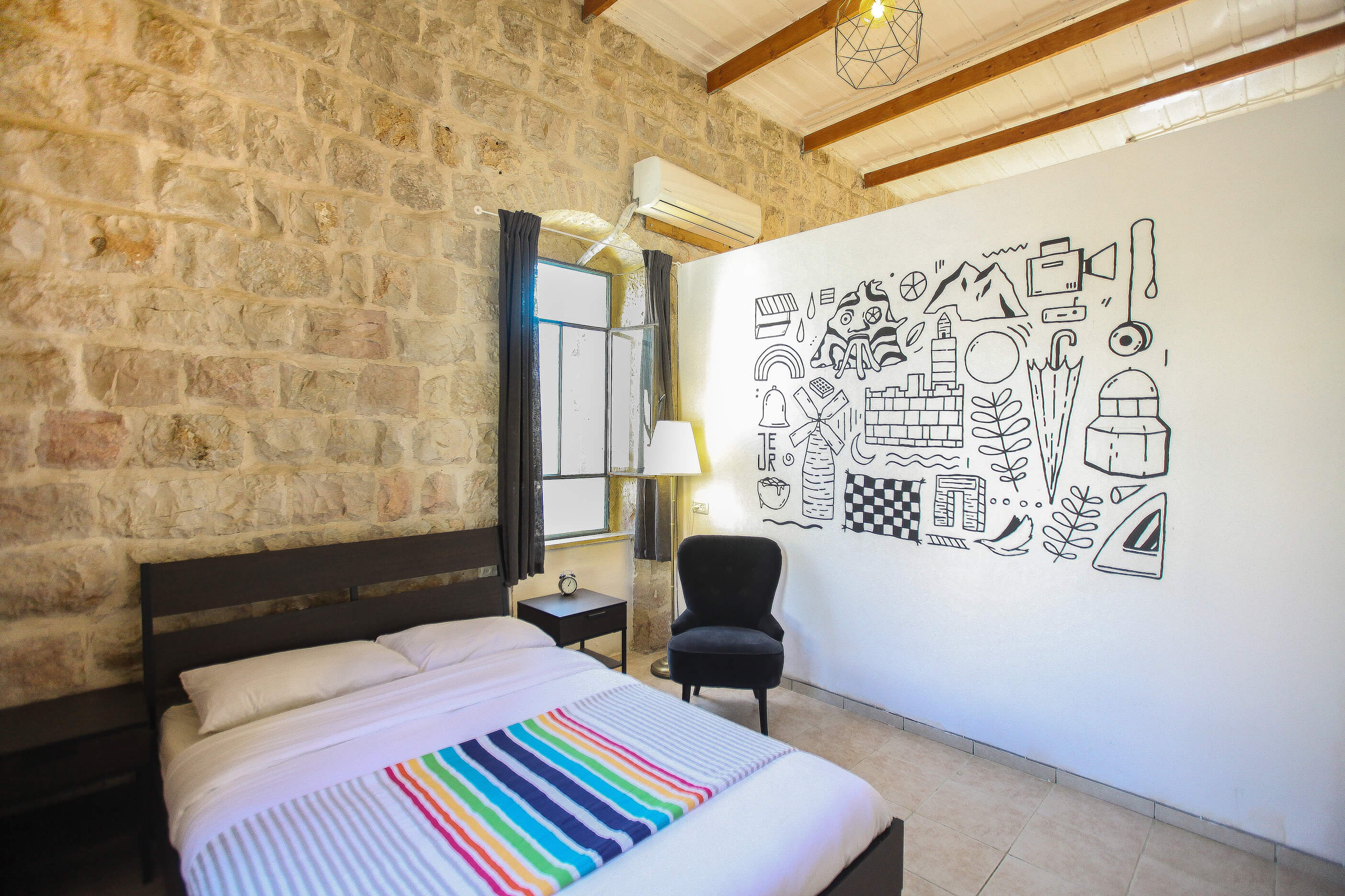 מלבד המיקום המרכזי והמחיר הנוח, הדירה כוללת את כל הפסיליטיז ההכרחיים לסופ"ש מפנק ויותר מהכל- היא מצטיינת בתחום העיצובי. אל תתנו לקירות האבן החיצוניים ולקרירות הירושלמית להוליך אתכם שולל- בתוכם מסתתר חלל בועט ושובב, עם כל הרהיטים והאקססוריז הנכונים, לצד קירות מעוטרים ציורי גרפיטי. אבל את הכוכבת האמיתית תמצאו דווקא מחוץ לדירה, בדמותה של חצר פנימית (משותפת) עתירת אלמנטים פסטורליים ומרגיעים. תוסיפו לזה יין של שקיעה, או קפה של בוקר והייאוש כבר מזמן התפוגג.
