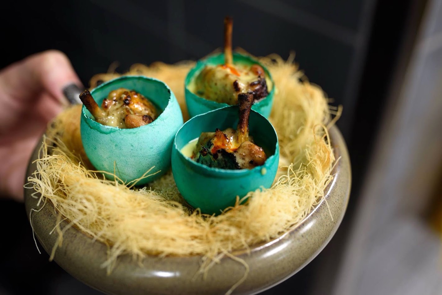 באחד מהימים בג'ונגל יוסי נתקל בתרנגול בר ומתוך רעב כבד רדף אחריו במטרה להפוך אותו לארוחתו הבאה. את התרנגול הוא לא הצליח למצוא אבל קן עם ביצים דווקא כן ובכדי לשרוד הוא שבר אותן ושתה את תכולתן. מי שראה את הסרט וודאי זוכר סצנה בלתי נשכחת בה הוא אוכל גוזל מתוך אחת הביצים, סיטואציה שמהווה את הבסיס למנה. אל תתנו לסיפור הלא מאוד חינני להטעות אתכם, המנה בהשראתו היתה יופי.